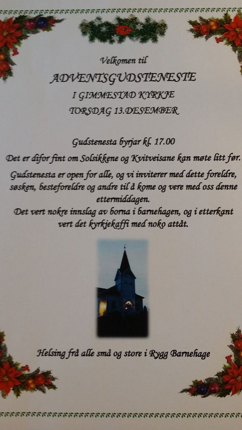 Rygg barnehage skal ha adventsgudsteneste i Gimmestad kyrkje torsdag 13.desember kl.17. Alle er hjarteleg velkomne til å vere med!